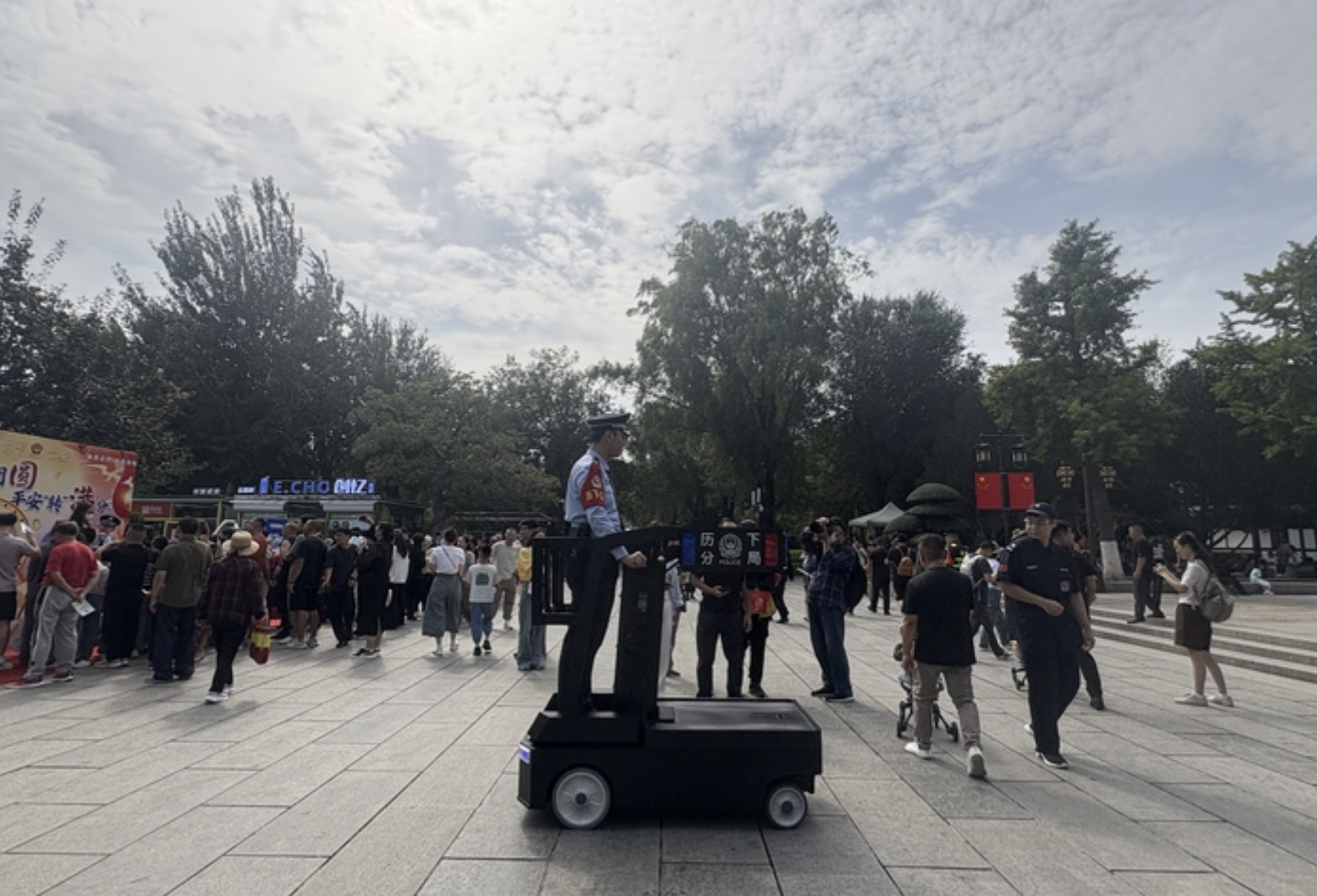 智能机器人“历小警”熟练地指挥疏散往来人流,时不时与现场群众亲切互动,发出安全提醒,成为景区一道亮丽的风景线。
